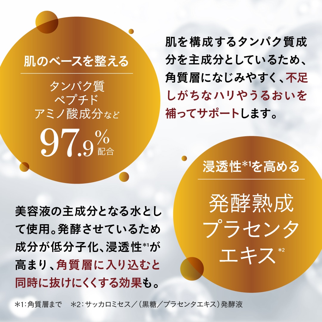 プラセンタエキスを酵母・黒糖でじっくり発酵・熟成したエキスを美容液の主成分として使用、より濃厚な保湿をかなえます