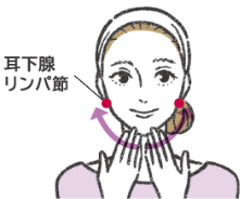 左右の中3本の指をあごの中央に当て、あごラインに沿って耳下線リンパ節までゆっくり押し流す。